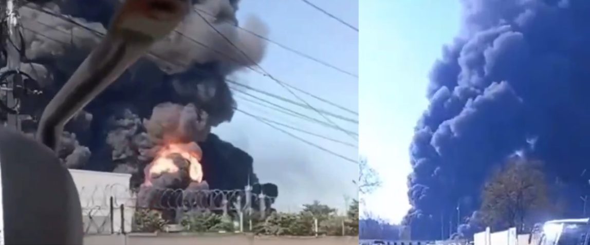 Filmklipp från händelsen visar hur den stora anläggningen står i lågor. Massiva bränder har brutit ut på minst två platser, rapporterar Kyiv Post.